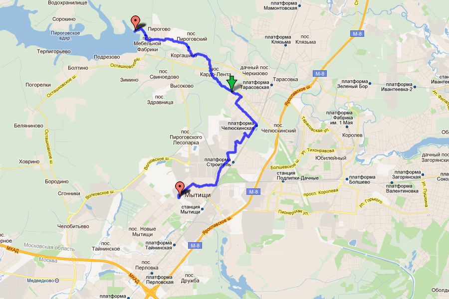 Погода сегодня сделала подарок и не смотря на прохладный северный ветерок — было солнечно. Решено было покататься на велике — маршрут: Мытищи-Челюха-Пирогово. заодно решил опробовать гугловскую фишку на Андроиде «Трекер» — отмечает маршрут следования на карте. Результат эксперимента: